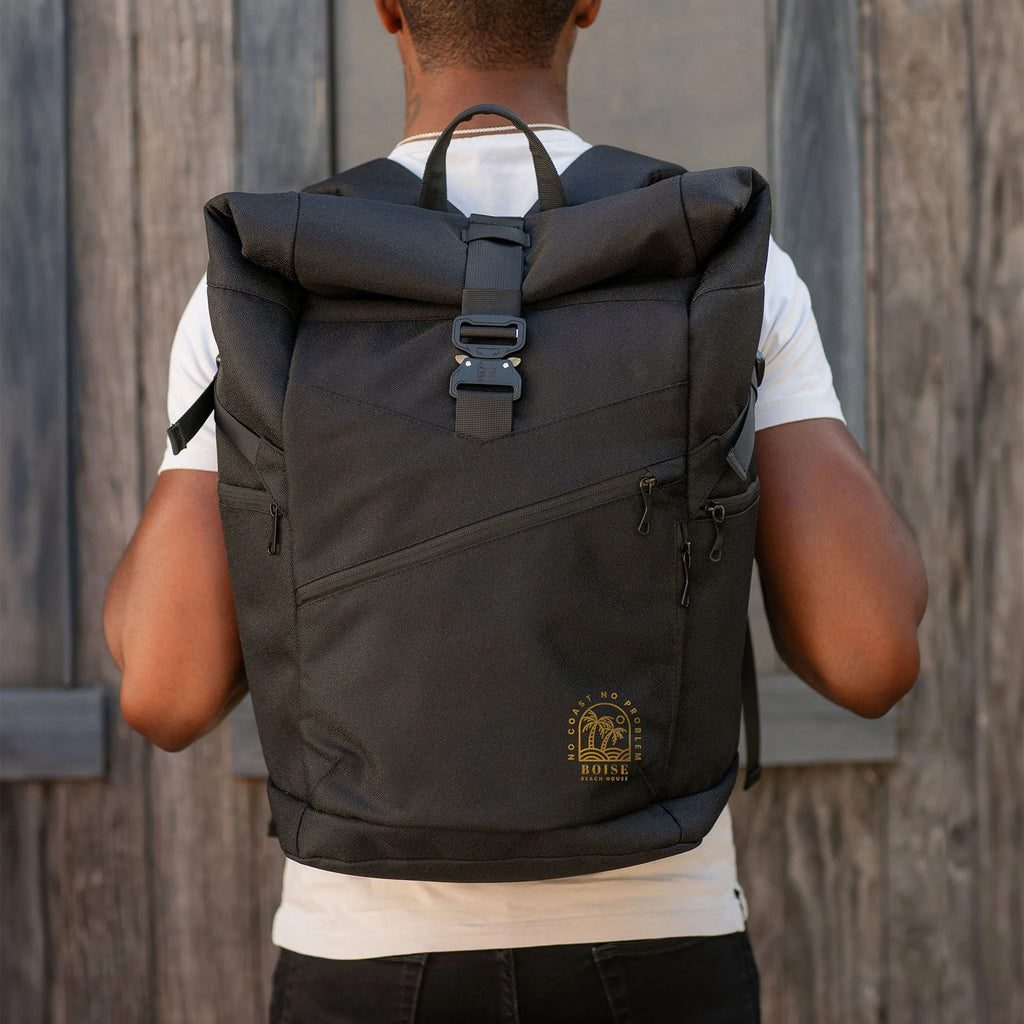 - Roll top shape with aluminum seat belt quick release buckle closure