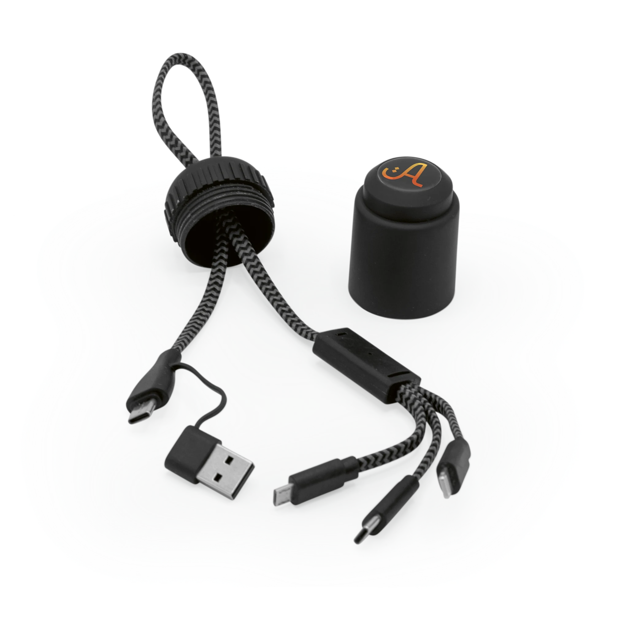 Say farewell to cable chaos with our sleek, portable cord. This pocket-sized powerhouse features the following connectors: two USB-C, one USB-A, one Micro USB, and one iOS-Compatible cable, all neatly wrapped in a stylish tube.