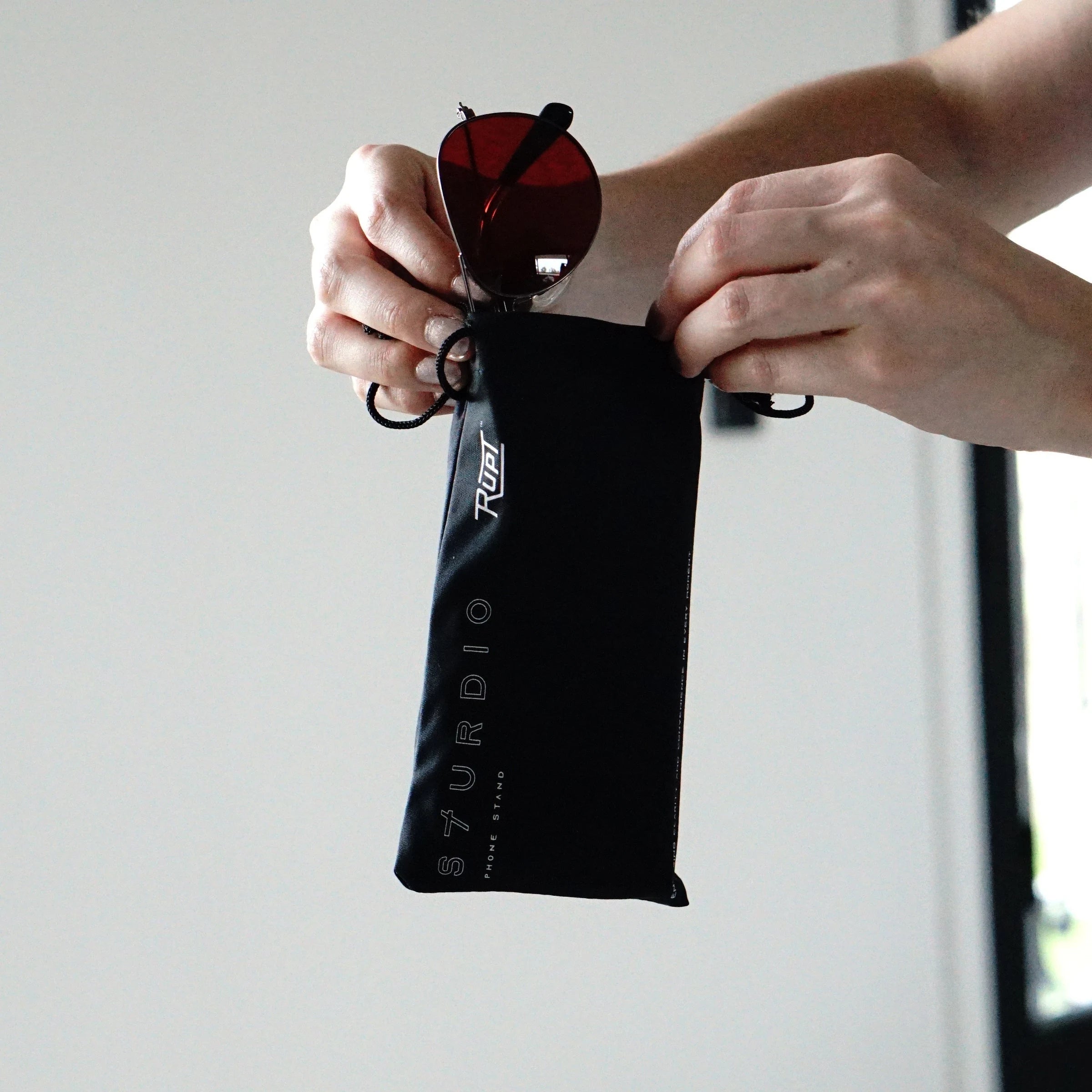 STURDIO packaging transforms into a: SUNGLASS BAG