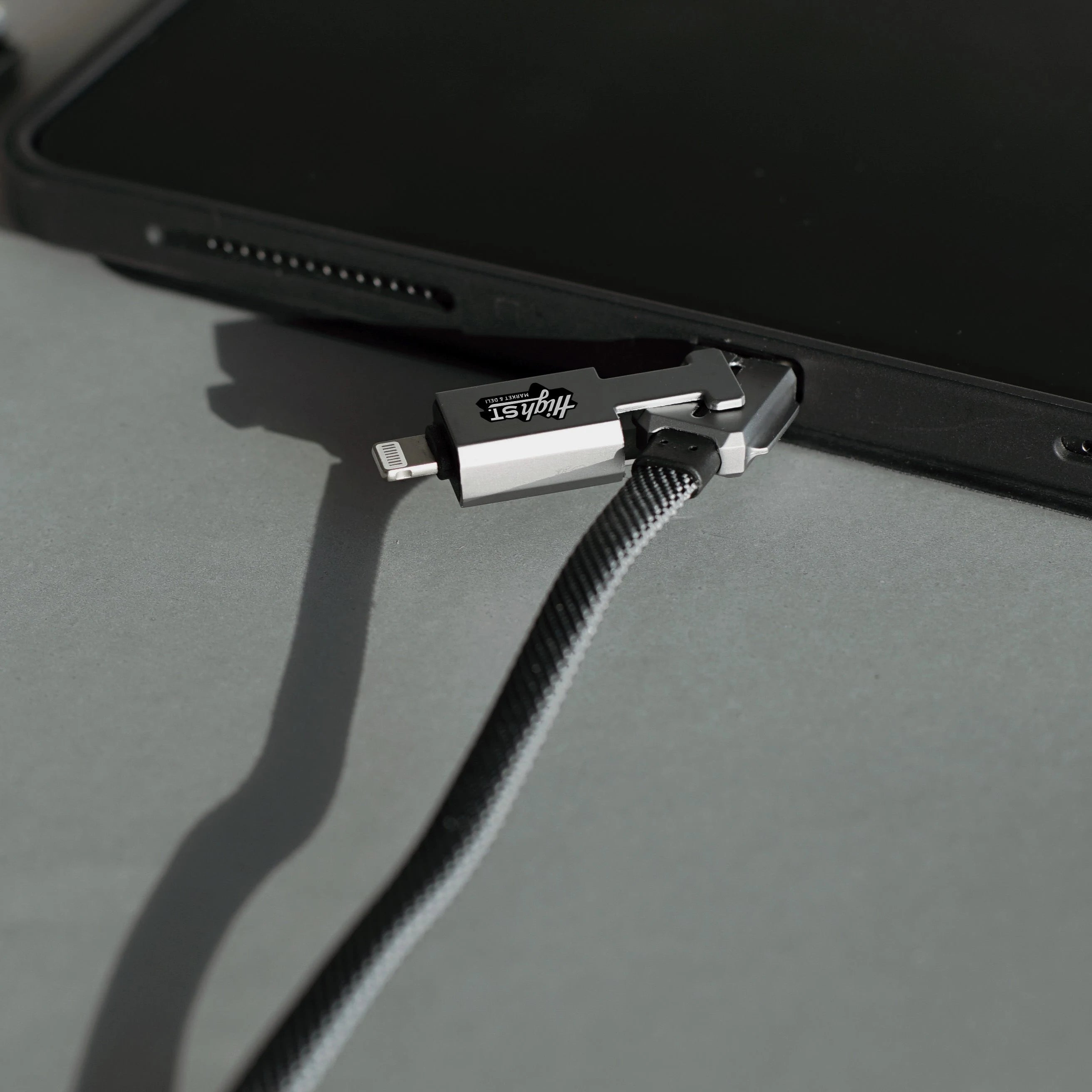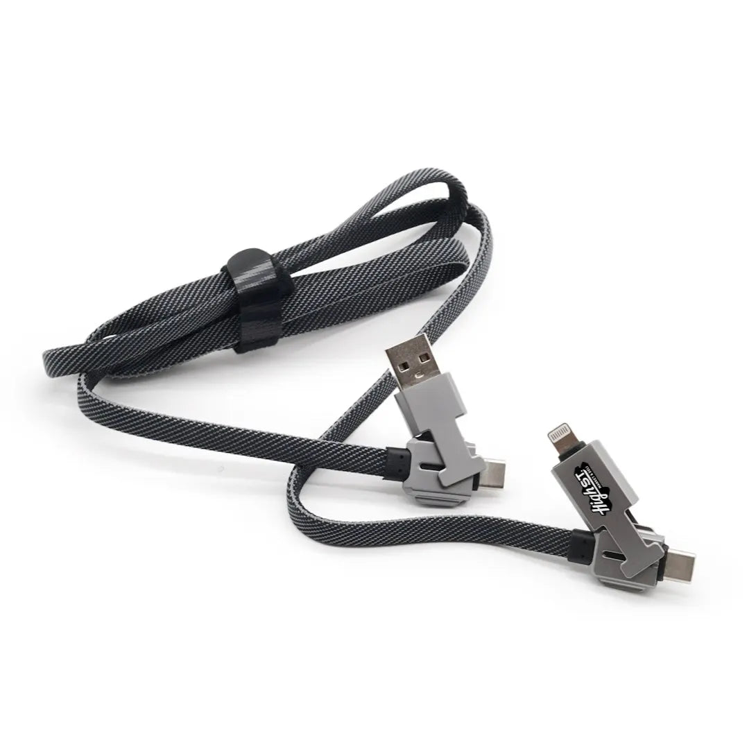 Its innovative design features easily interchangeable tips for seamless compatibility. On one end, a Lightning tip snaps off to reveal a USB-C connector, while the other end transforms from USB-A to USB-C with a quick snap. Effortlessly switch between devices without juggling multiple cords.